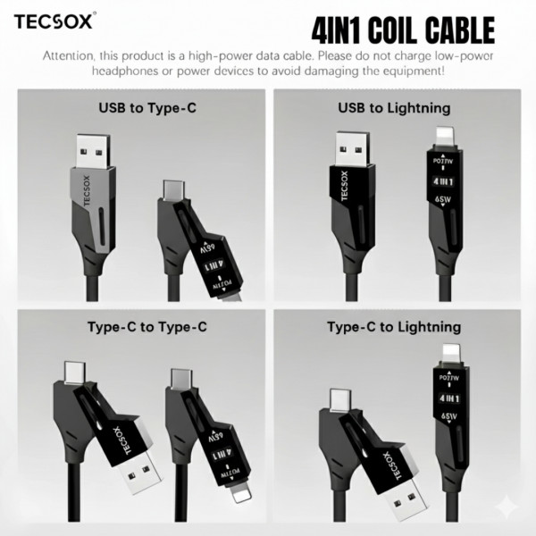TecSox 4-in-1 Coil Type-C Cable is designed for users who want premium performance, powerful sound output, and long-lasting durability. Crafted with advanced audio engineering, this device delivers crystal-clear highs, rich mids, and deep bass, ensuring an immersive entertainment experience. With its enhanced battery efficiency, sleek design, and stable connectivity, it is perfect for music, calls, gaming, and everyday use. Ideal for travel, work, or home, the device provides reliable performance and seamless compatibility with all smartphones and Bluetooth-enabled devices.