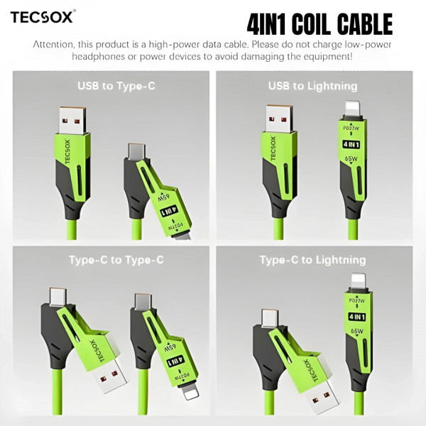 TecSox 4-in-1 Coil Type-C Cable is designed for users who want premium performance, powerful sound output, and long-lasting durability. Crafted with advanced audio engineering, this device delivers crystal-clear highs, rich mids, and deep bass, ensuring an immersive entertainment experience. With its enhanced battery efficiency, sleek design, and stable connectivity, it is perfect for music, calls, gaming, and everyday use. Ideal for travel, work, or home, the device provides reliable performance and seamless compatibility with all smartphones and Bluetooth-enabled devices.